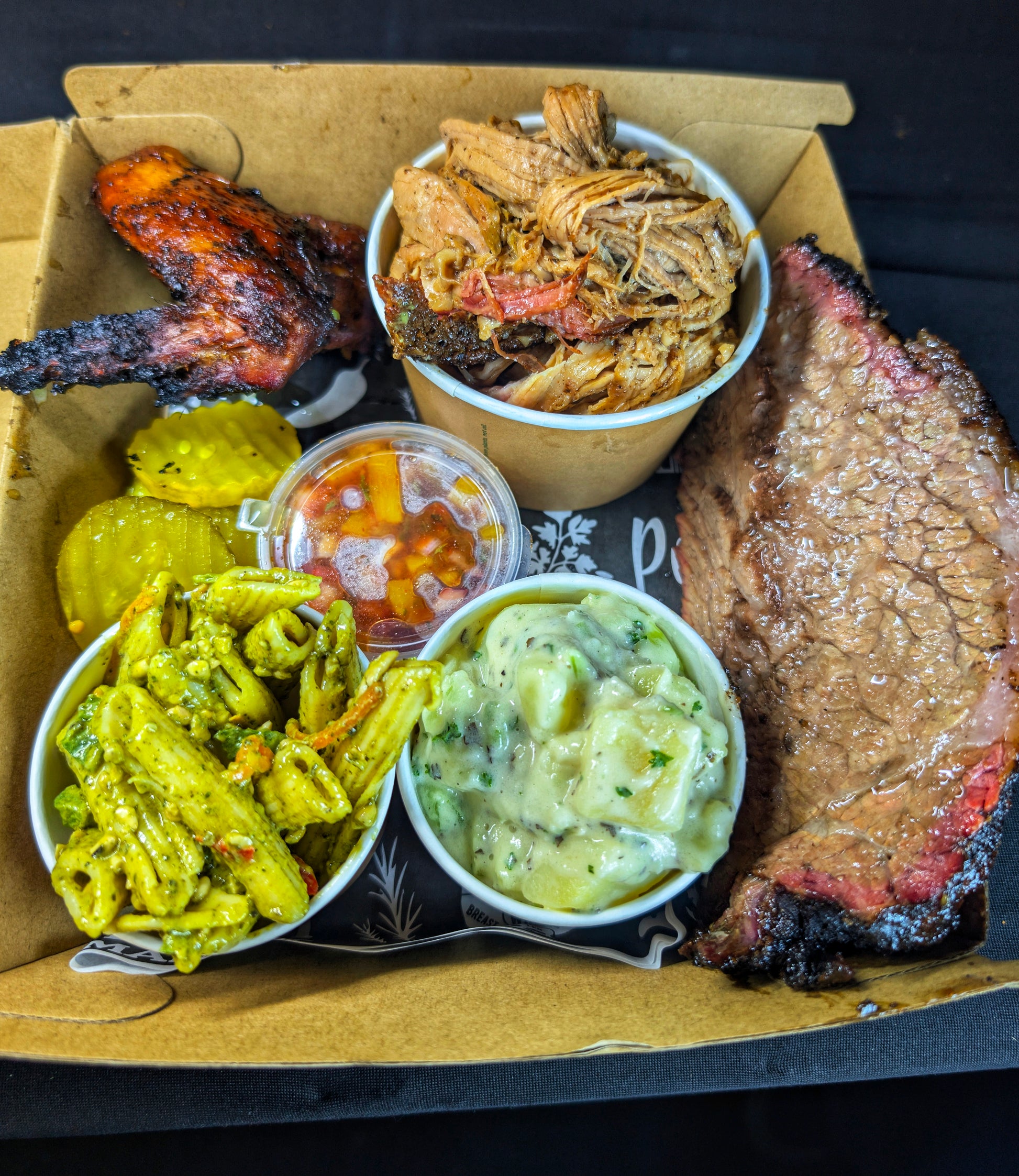 1 person: Brisket, Pulled Pork, Texas Hotlink, 2 small sides, pickles, tortillas + Boomtang salsa