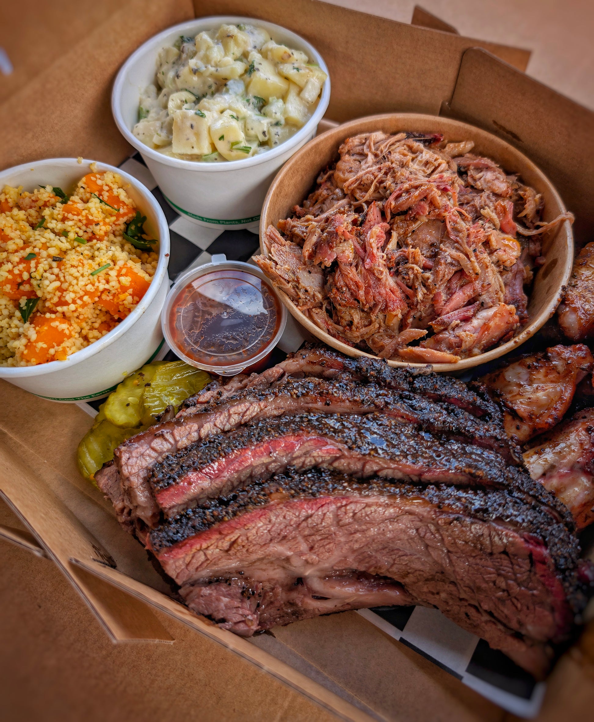 4 person: Brisket, Pulled Pork, Texas Hotlinks, 2 large sides, pickles, tortillas + Boomtang salsa