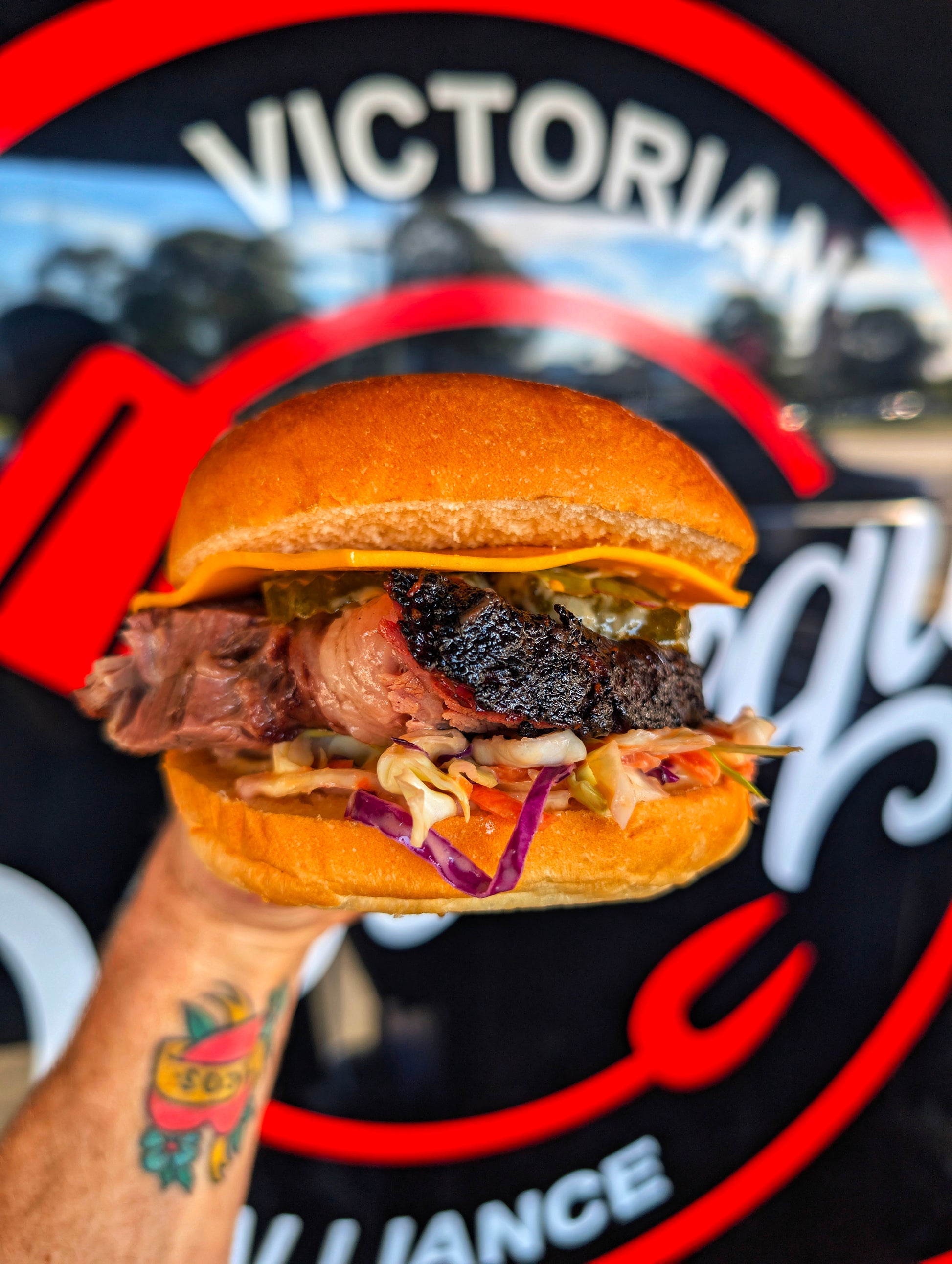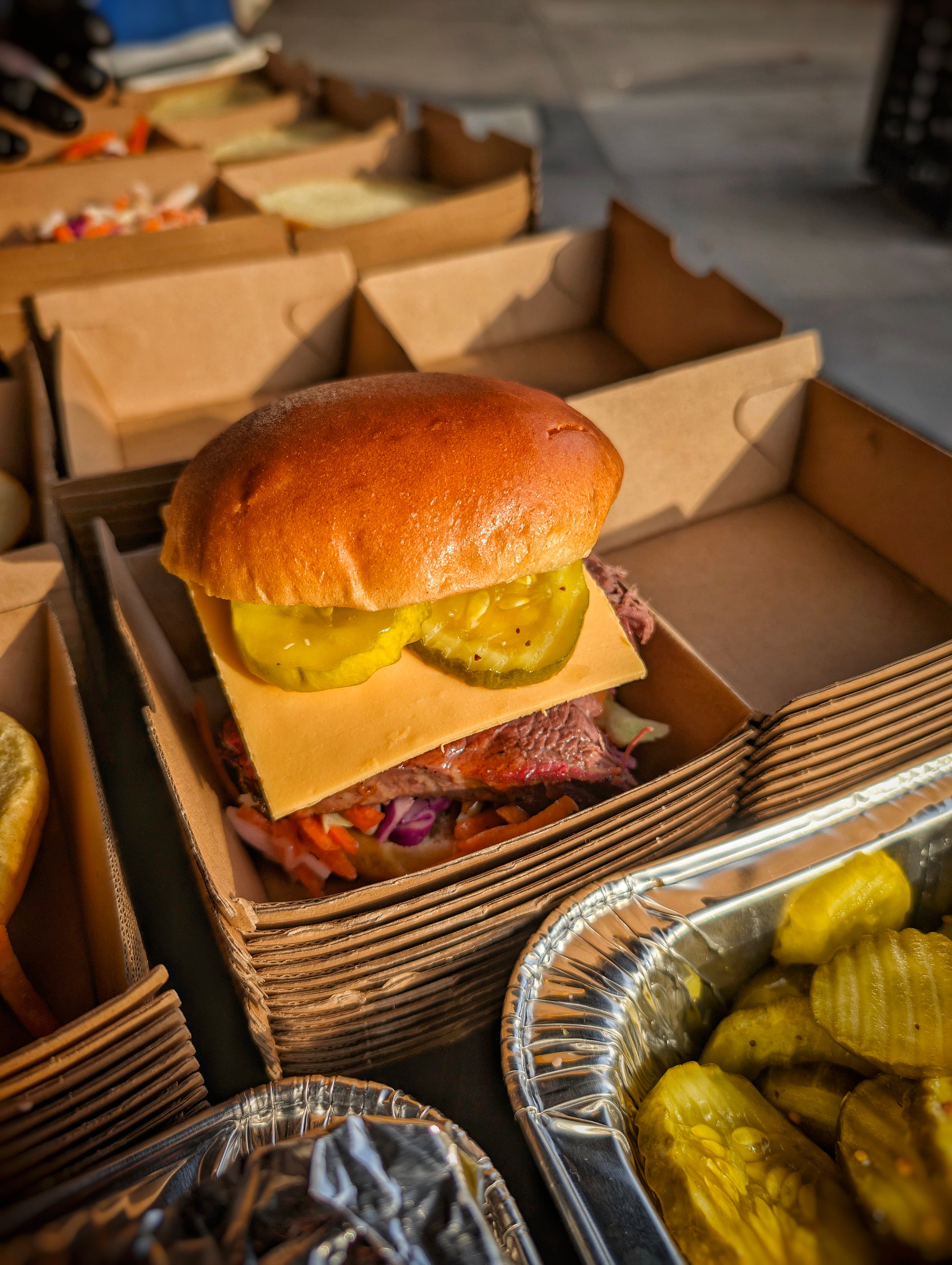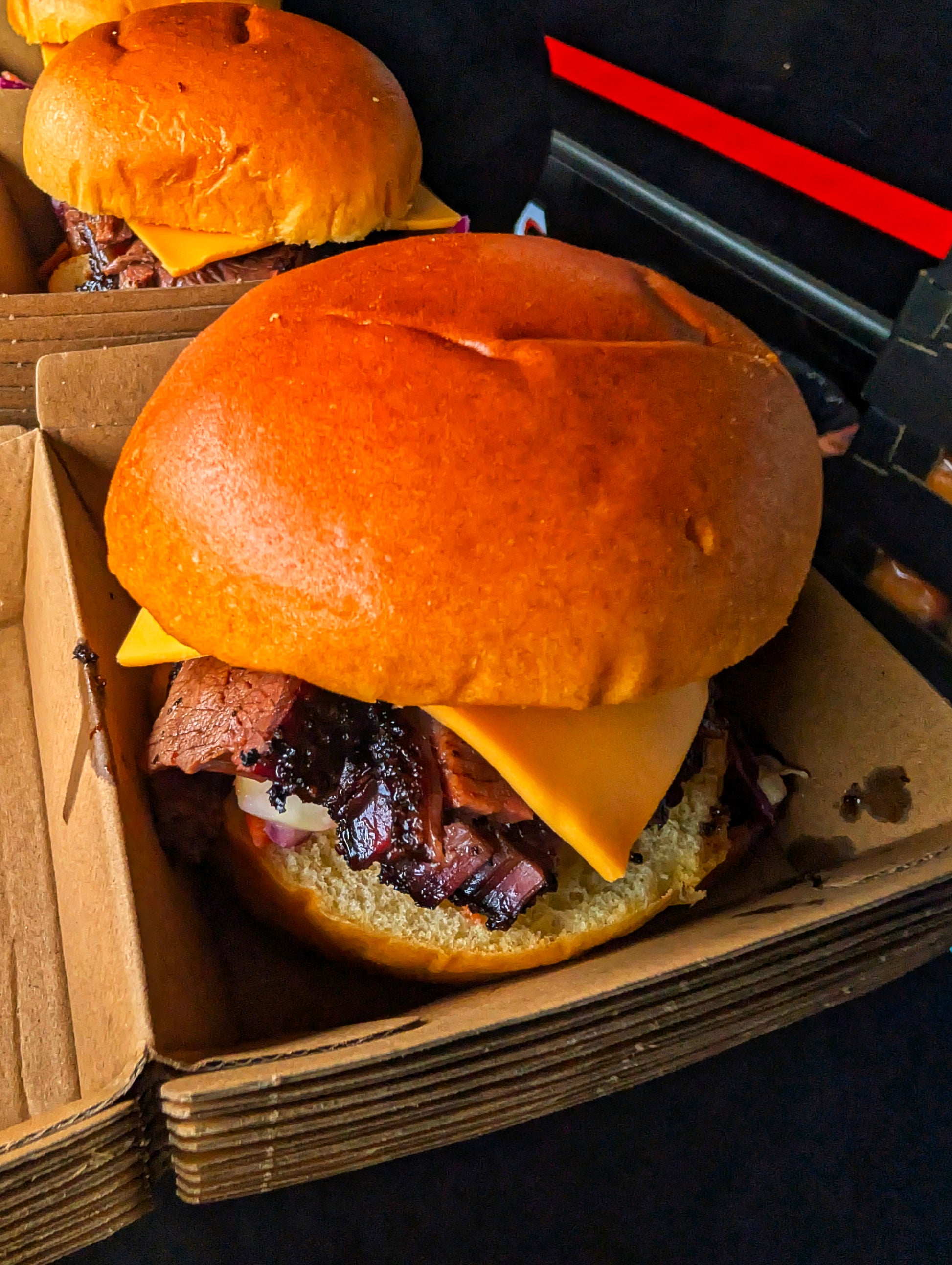 A Brisket Roll consists of Brisket, Cheese, Burger Sauce, Coleslaw and Sweet Pickle